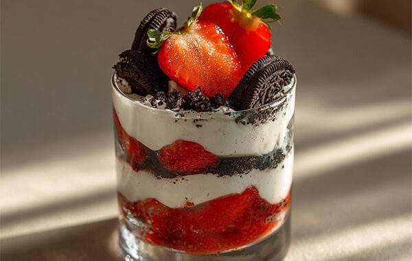 Ajoute quelques morceaux d’Oreo et une fraise sur le dessus pour le visuel.